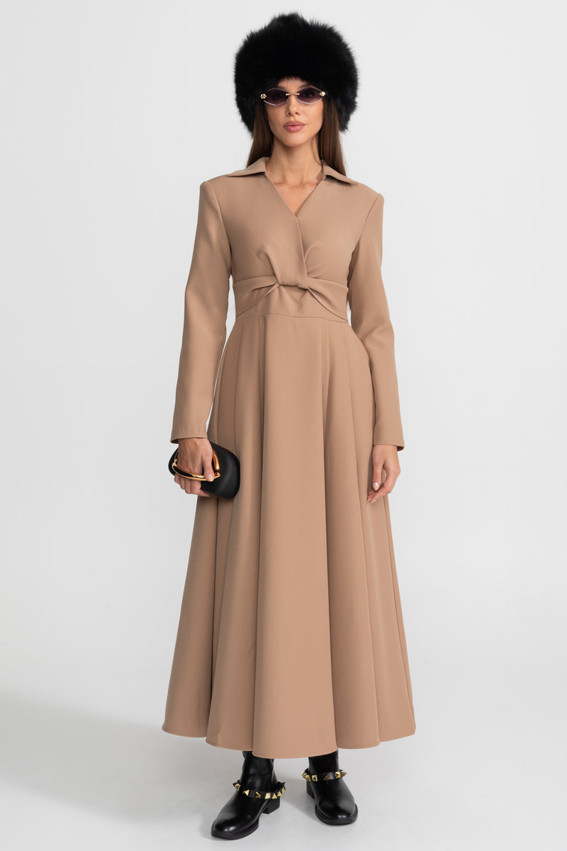 Long Sleeve Dress With Knotted Waist Detail – Camel