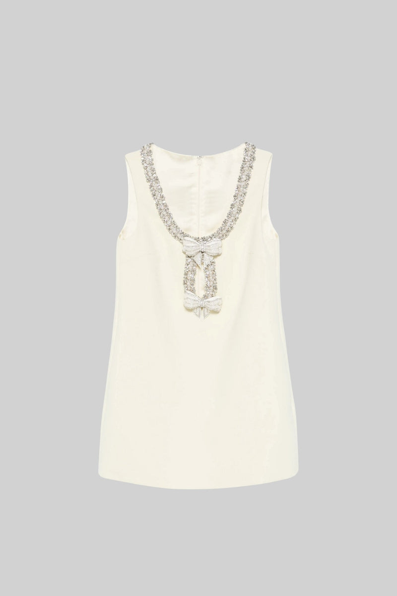 Sleeveless Mini Dress With Intricate Sparkling Neckline And Bow Embellishments - Ivoire