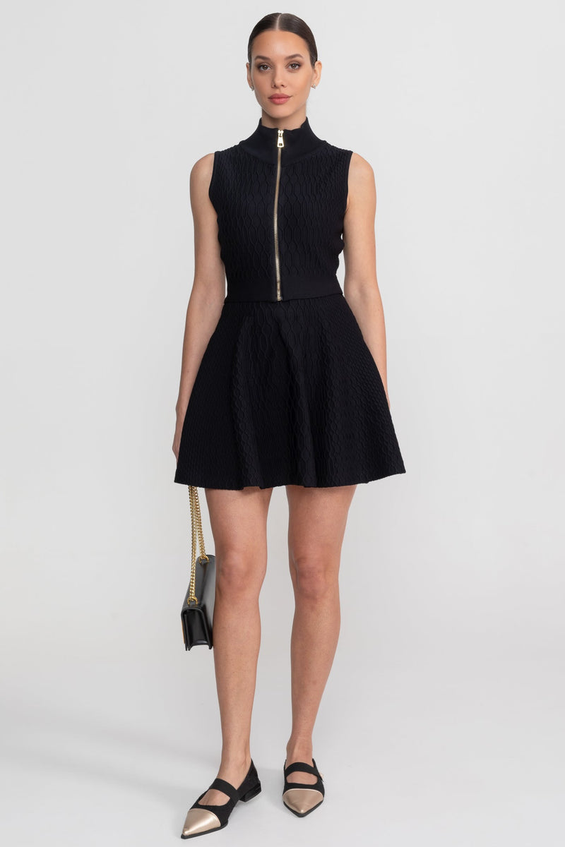 Black Textured Co-Ord Set With Sleeveless High Neck Top And Matching Mini Skirt