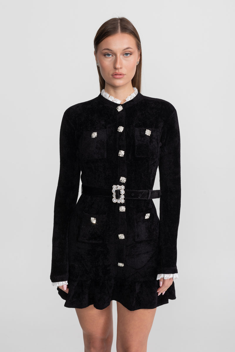Knit Crystal-Button Mini Dress With Matching Belt – Black
