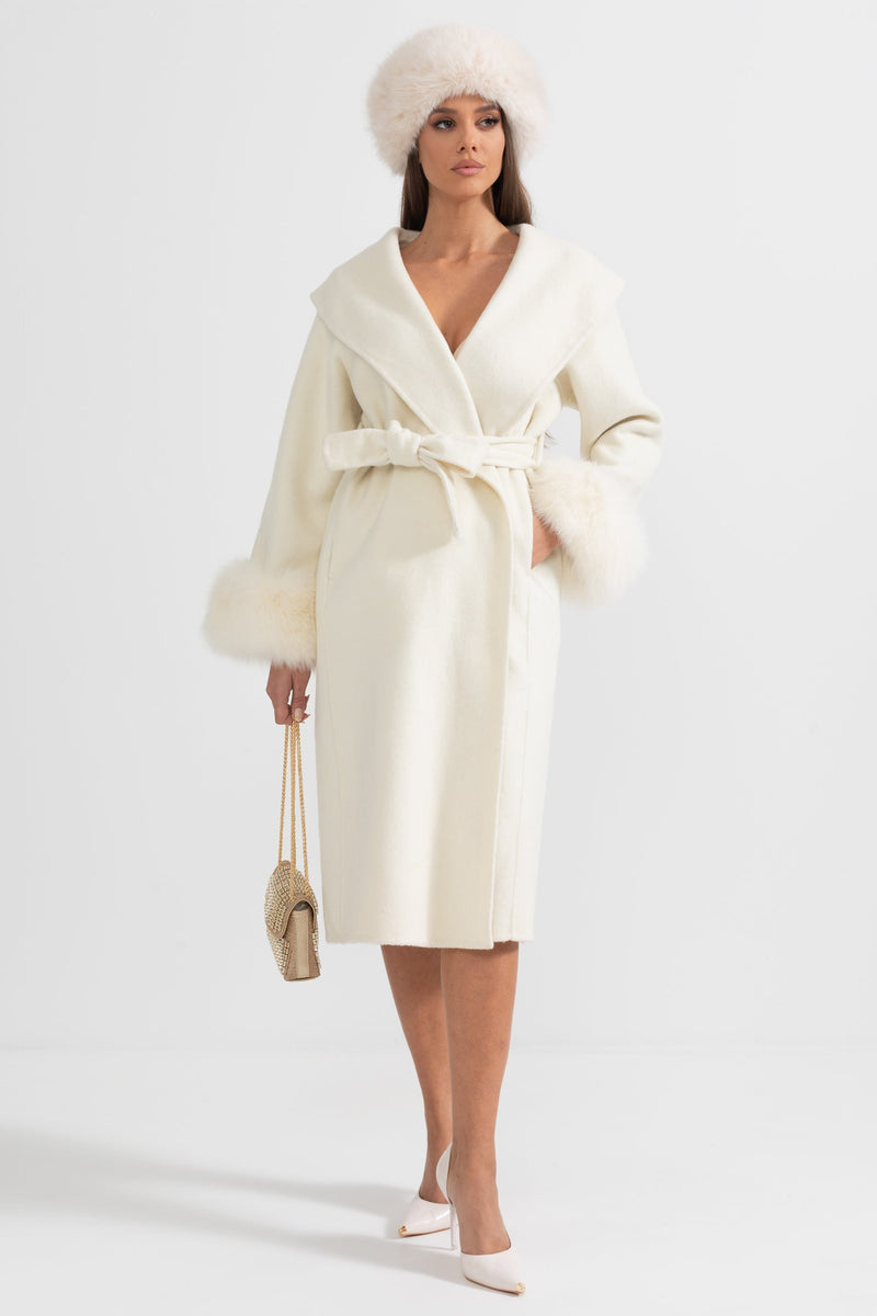 Palton lung luxos Ivoire din cașmir cu manșete din blană de vulpe