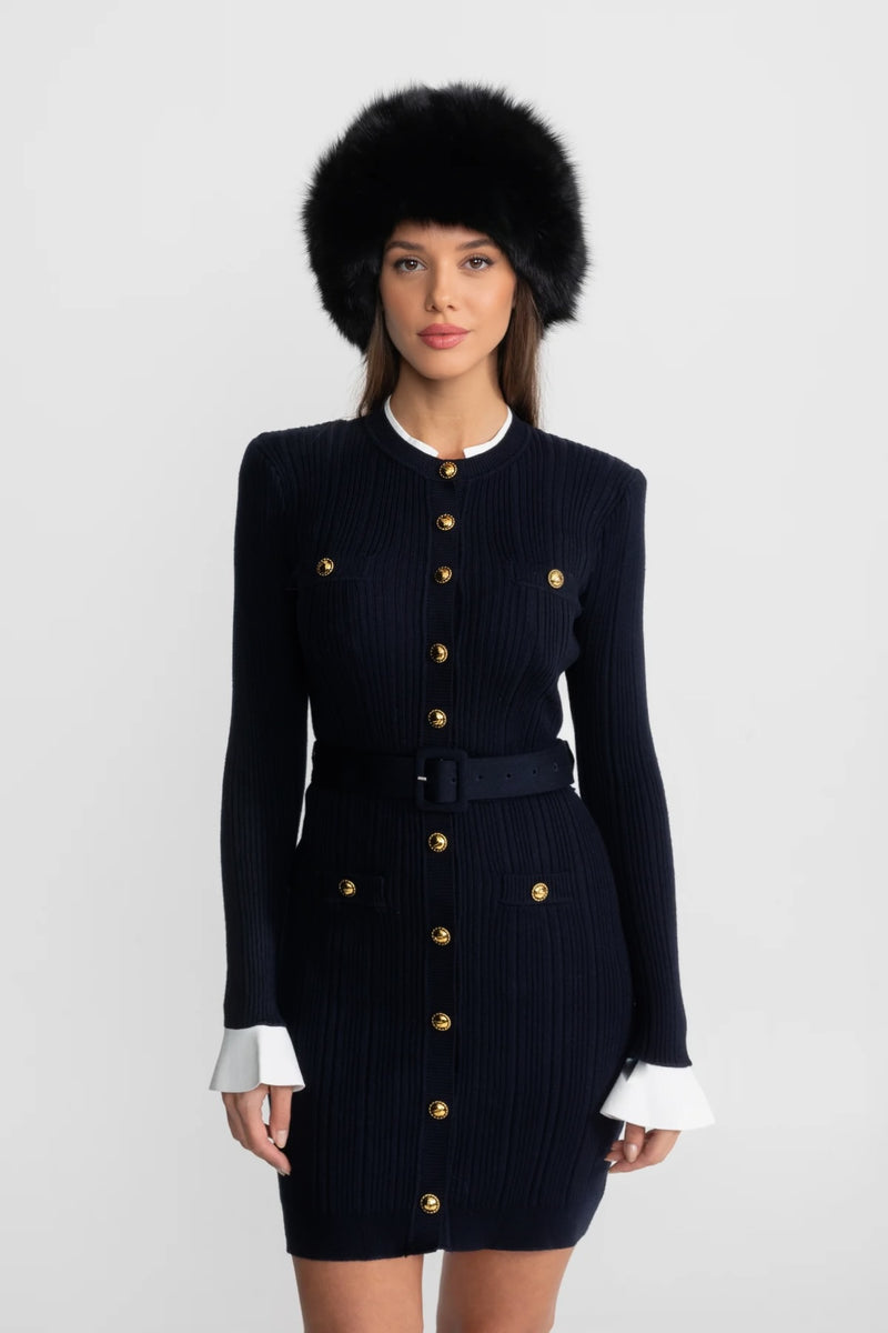 Rochie mini tricotată în nuanță Dark Blue cu nasturi aurii
