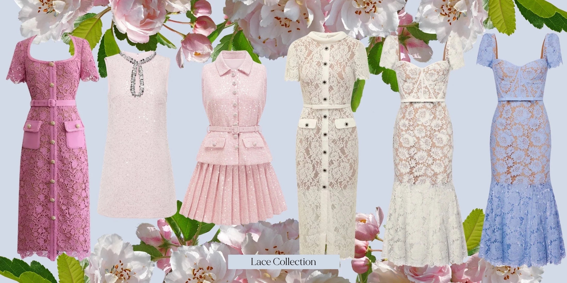 Lace Co-ord Set with Embellished Collar and Buttons - PinkSheer Dress With Fitted Waist And Floral Appliques - Light Blue